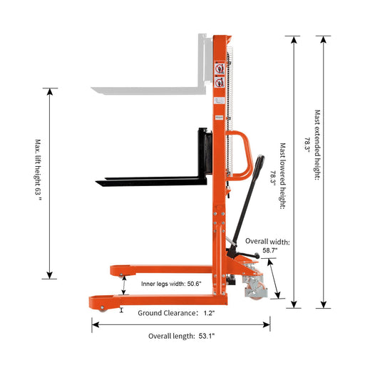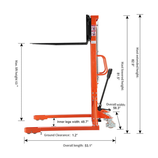 View full detailsDescription Tory Carrier T-3003 | Manual Pallet Stacker | 2200 lbs Capacity | 63" Lift Height This manual stacker handles loads up to 2,200 lbs w...